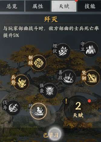 还有歼灭这个天赋目前也是比较推荐大家去加点的,这个天赋目前是针对玩家之间作战的提升效果,在其中对歼灭进行加点之后,大家只要跟其他玩家之间的部曲进行作战,在其中都可以对敌人的士兵死亡概率带来一部分提升,不过只有5%的数值,所以不算很高,但是如果大家想要在玩家之间的对战当中得到一部分的优势这个天赋也是值得大家去点的,那么游戏中除了这些万能的加成天赋效果之外,还算在一起另外针对不同兵种进行加点天赋效果,这些要分兵种的天赋效果就需要仔细查看其中能力。