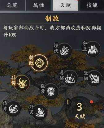 另外还有一个是制敌,这个天赋其实也是全兵种都用得上的,对这个天赋进行加点的时候部曲的强度会在攻击以及防御双属性当中得到提升,且都是提升10%,所以这个针对基础属性进行提升的天赋效果不管是什么兵种都用得上,也算是一类全能加点的选择。类似的还有埋伏这个天赋,这个天赋其实目前就是比较挑地图,在其中大家如果参与的野外树林战役,或者是一些内战,这里就可以搭配这个天赋,进行加点的时候这个天赋可以让大家在上阵部曲自身属性上面得到10%的提升,所以其实效果跟上面的制敌是类似的,大家在加点的时候如果觉得一个制敌增加的百分比不够的时候,也可以把这两个添堵一起进行加点。