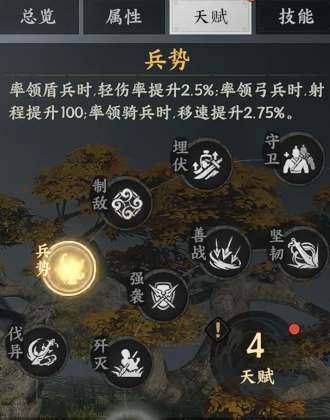 如果要给武将的天赋进行加点的话,建议大家可以先考虑去加点兵势,这个天赋不管是盾兵还是骑兵或者是弓兵都是可以用上的,这个叫做兵势的天赋可以让大家在其中给不同兵种带来他们定位效果的不同能力,如果是给盾兵加点的话,天赋能力上面会有轻伤概率当中2.5%的提升效果,如果是给弓兵进行搭配的话,这里弓兵在上阵对敌人进行暑促胡的时候,会有100的射程提升效果,可以攻击的范围更大,而另外给骑兵进行加点的时候,他们在场内的移速上面会有2.75%左右的提升,所以在加成效果上面基本是覆盖了全兵种的,那么这个天赋就是所有兵种都可以进行加点的。