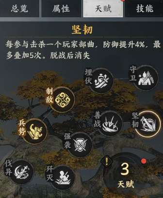 比如说盾兵必点的一个天赋就是坚韧,这个天赋能力就是让敌人每参与了击杀敌人,且成功的情况下,给自身部曲带来防御数值上面4%的提升,相比较于其他的提升效果,这个能力是最符合当前盾兵效果的,另外这个加成放在防御属性上面最多是可以叠加到5层的,也就是说最大是可以达到20%的数值,不过这个天赋加成一旦是大家脱战状态的话,会直接失效,所以大家要前期叠加快一点。如果是用骑兵比较多,建议大家可以选的是善战这个天赋进行加点,这个天赋是大家每参与击杀对面部曲的时候,在其中使用攻击的能力可以提升4%,同样也可以有5层的叠加,比较针对骑兵的优势,而在弓兵的天赋能力当中就建议大家去看看这里的善战同样增加输出,但是除此之外还有类似于伐异、守卫这类天赋也是给基础属性带来提升的,大家有额外点数也是可以进行加点的哦。
