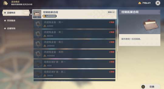 可以看到,第三阶段的奖励要求一点难度都没有,把【芙里达】商店新出的两个物品买了就行,一个是【装饰、一个是【经销商合同】。商店买空,助益升满,正常炼药即可。