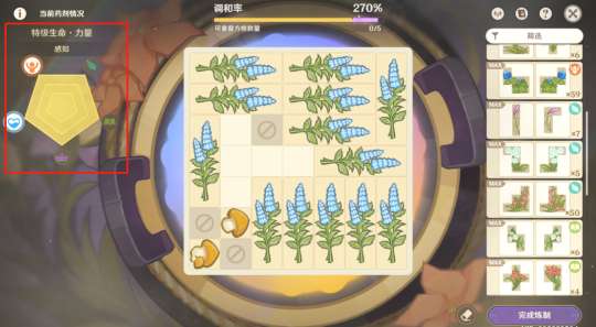 把薄荷放满,就会出现6个属性都到特级的情况,你需要什么主属性,就随便放一个这个属性的药材就行,一般都会属性双属性金色药剂,所以放其它的药材也有可能出现你需要的这个主属性。