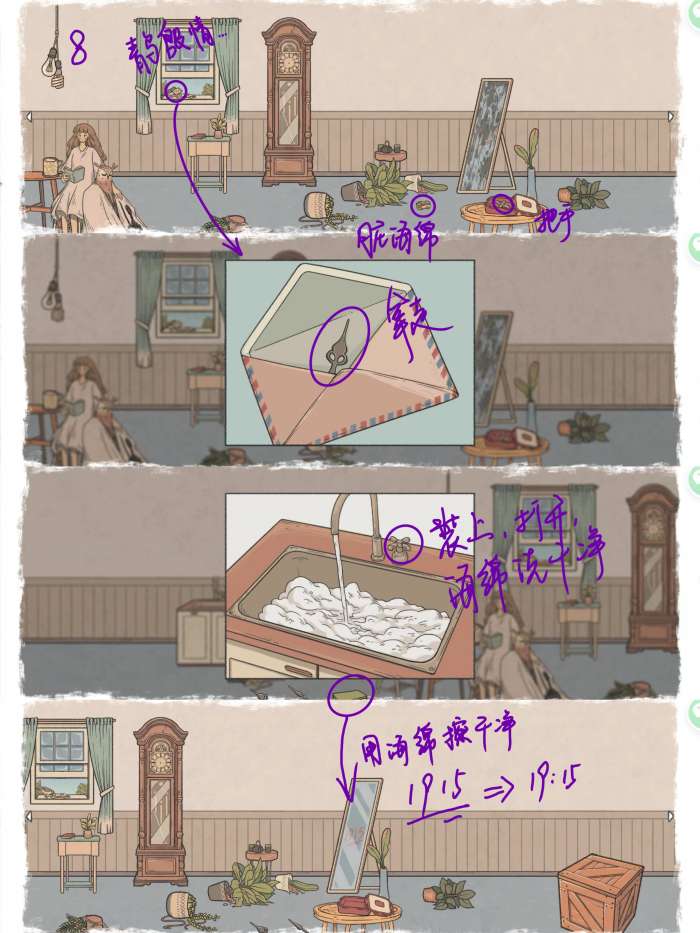 图8: 打碎矮凳上的绿植,捡起地上的脏海绵,打开桌上的盒子拿走龙头把手 打开鸟送来的信,拿走里面的指针 给水龙头装上把手,打开水龙头,洗干净海绵 用海绵擦干净镜子得到线索19:15