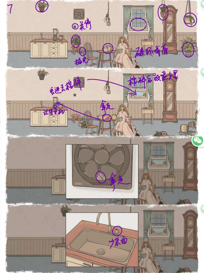 图7: 点开关关停排气扇,插上接近地面的那个插座,打开窗户 移开桌面上的两个杯子,拿走面包,面包放进榨汁机打开开关榨碎,面包碎放到窗台的盘子上(打开鸟送来的信,拿走里面的指针) 拿走排气扇后边的指针 水龙头缺少了把手