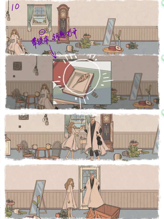 图10: 用钥匙打开钟座左边桌子上的本子 点击羽毛 点击羽毛 点击门