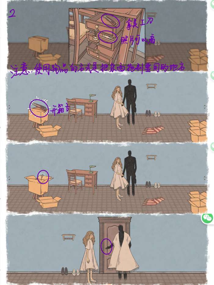 图2: 使用钥匙打开两个抽屉,拿走美工刀 用美工刀开桌子左边被封住的箱子,点击羽毛 点门进入下一场景