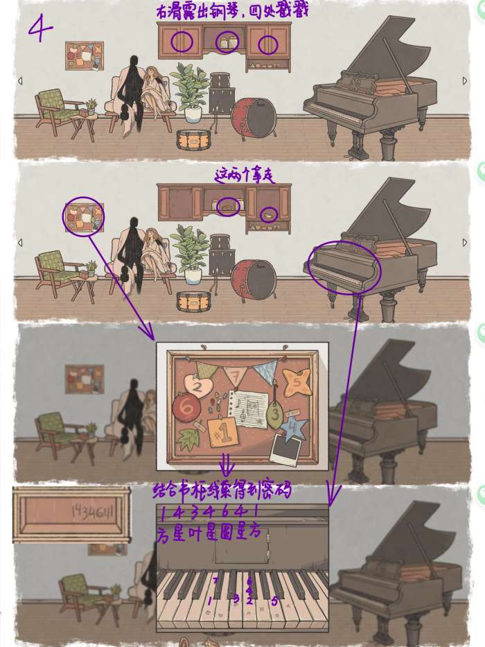 图4: 滑到界面最右边,打开两个橱柜拿到猫头鹰道具(右边),移开两个玻璃罐拿走道具 墙上挂的留言板上是个线索 结合书柜的线索1434641,在钢琴键上依次按下:正方形、五角星、叶子形、五角星、圆形、五角星、正方形