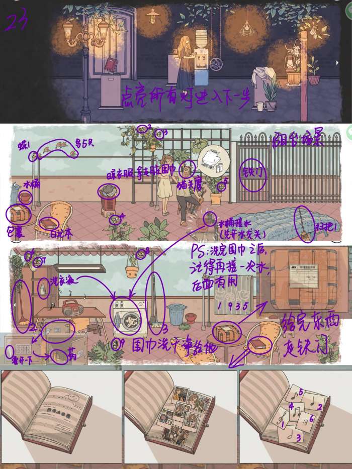 图23: 点亮场景内的所有灯进入新场景 捡起水桶,打开水龙头用桶子接水,晾好衣服拿走脏围巾 滑到界面左边,打开柜子拿走洗衣液,围巾丢进洗衣机,洗衣液和水倒进洗衣机,按下开关,根据晾好的被子上的提示数数,解开保密柜得到药,药和围巾给猫头鹰先生,从铁门离开之前记得再接一次水