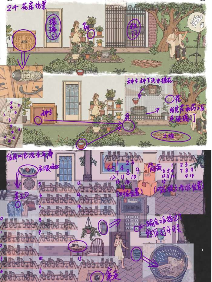 图24: 花房场景,根据日记本上的线索解开左边带锁的柜子, 拿走种子,种子种在空花盆里,浇水花长出来摘花,拿走架子中间的药,药和花给猫头鹰先生,从蓝白玻璃门离开 洗衣走廊,晾好蓝白玻璃门旁边的衣服,从挂好的衣服口袋里拿走美工刀 右滑界面,解开桌上的猫头鹰和小鸟对换的游戏得到方珠子(我第一次见到这个游戏是在绣湖系列某个游戏里的跳青蛙),翻垃圾桶得到线索,解开门旁边的开关锁,打开开关