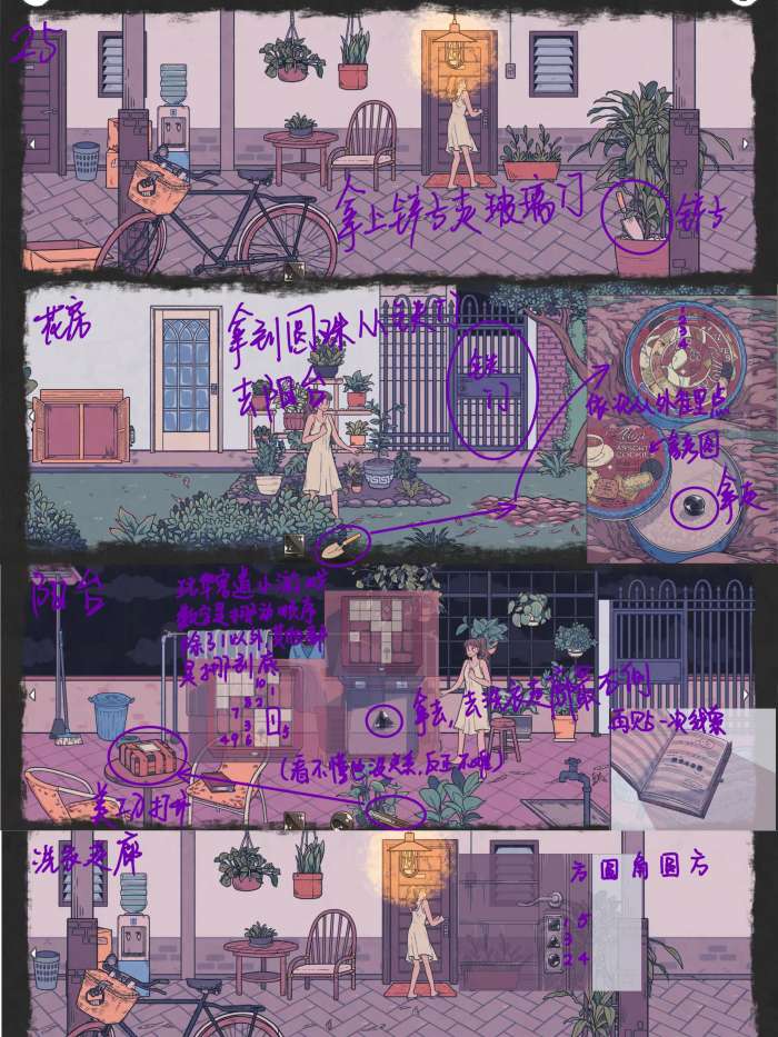 图25: 拿上右边柱子旁边的铲子,从蓝白玻璃门到花房场景 用铲子挖土,打开盒子(从最外圈开始点)拿到圆珠子 从铁门去阳台场景,用美工刀打开包裹玩华容道游戏解锁盒子拿到三角珠子,回到洗衣走廊最右边 把三个珠子放在门上,根据日记本提示依次按下:方、园、三角、园、方,进入房间