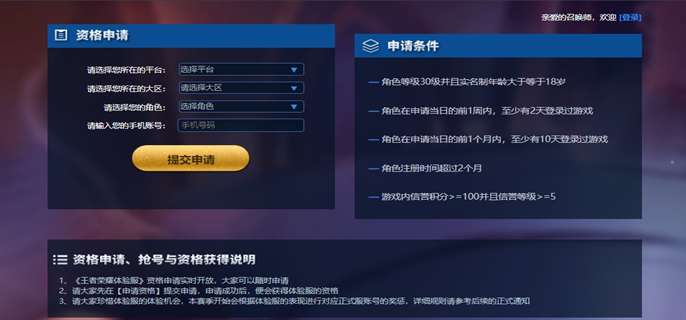 2、满足条件的玩家登录账号,输入所在的平台、大区、角色、手机号等信息,提交申请,等待官方审核;