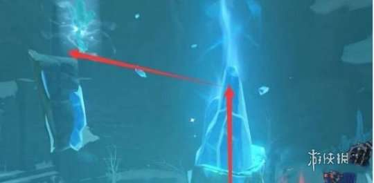 在山坡上跳跃到图中的柱子上,然后打破柱子上面的冰晶。