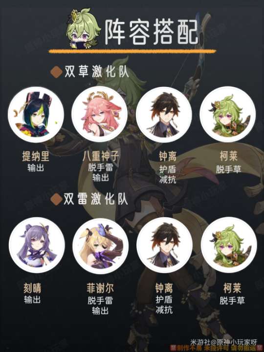 ① 双草激化队:提纳里+八重神子+钟离+柯莱
