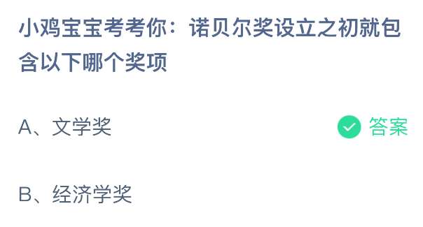 以上就是小鸡宝宝考考你:诺贝尔奖设立之初就包含以下哪个奖项,支付宝蚂蚁庄园2025年11月9日答案最新,更多精彩内容,请点击关注pk游戏网更新!