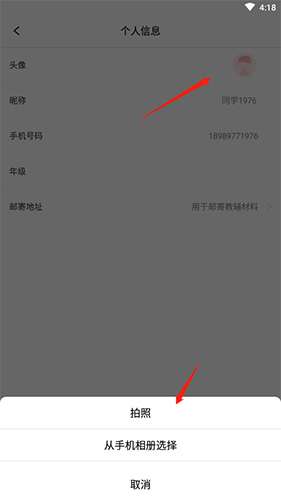 2、点击“头像”选项,你可以选择拍照或者从手机相册选择图片,然后点击确定即可。