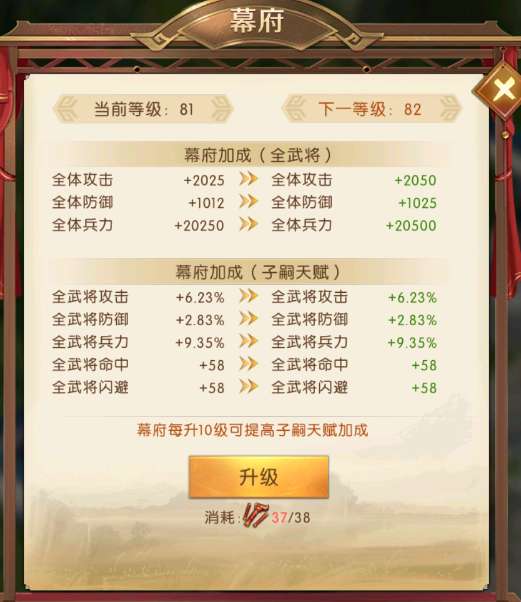 幕府需要消耗天木梁升级,等级越高需要的天木梁越多,每升10级即可提升子嗣的天赋,而且每次幕府升级也可以提升主公全体武将的属性。