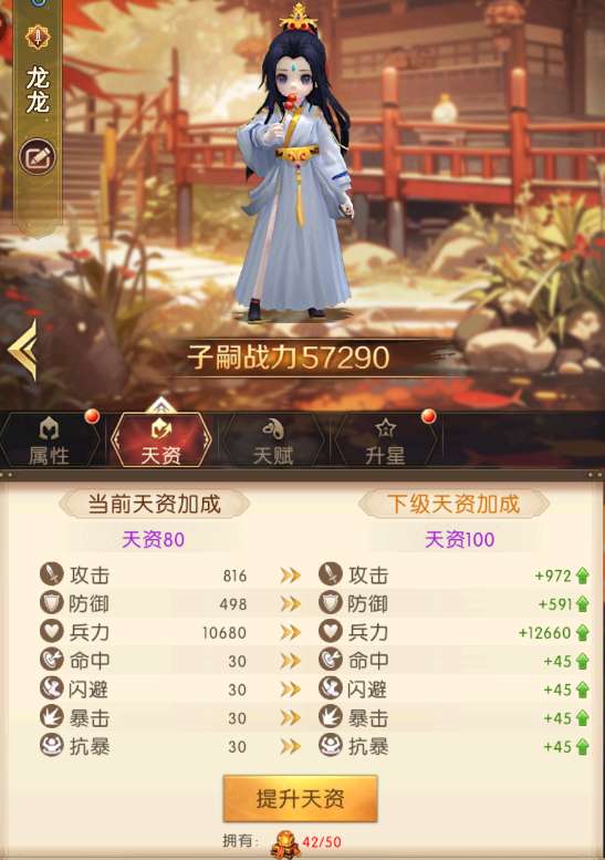 主公如果希望自己的子嗣不落于他人,就需要在幼主府里面给子嗣提升等级、学习技能,天资突破和升星噢。