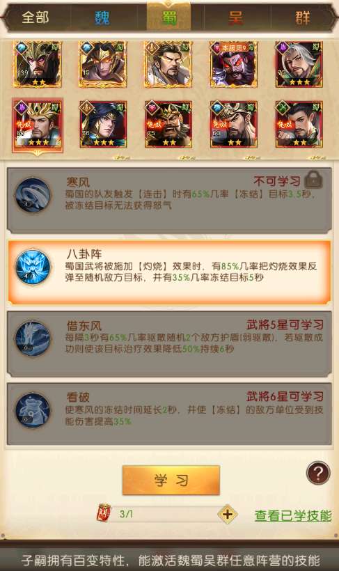 不过子嗣拥有百变特性,可以激活魏蜀吴群任意阵营的技能(需要有该武将并达到对应星级的技能,少部分武将技能设定不能被子嗣学习),让主公有更多的选择性搭配,但选择技能时需要谨慎注意,一旦该技能不满意需要遗忘技能时,遗忘后不可还原,且需要花费相应拜师帖重新学习!
