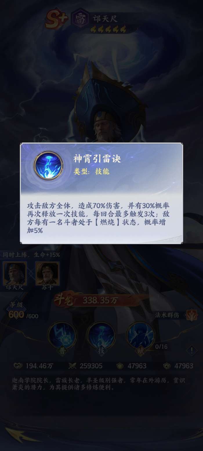 邙天尺的实力其实还是比较强悍的,而他属于法术纯伤,针对这方面的话相信玩家深入了解就可以看到,它的普通攻击技能,雷光坠,能够有效的打击敌人,并且还能够给敌人造成法术伤害,一旦形成这样的情况,能够为后续的爆发奠定一定的基础。而他真正的绝招其实是神霄引雷诀,一旦施展之后,往往能够有效地攻击全体的敌人,能够让敌人形成百分之70的伤害。