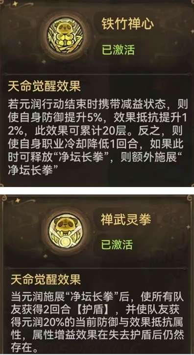 元润的基础技能几乎和普通的禅修弟子没有任何区别,在其二阶觉醒技能出来前因为五行灵根无法携带复活技能的问题导致连上一队的机会都没有。但是现在!“大人,时代不同了。”首先我们可以看到的是通过二次觉醒的元润拥有了这个游戏最大的核心之一“在动”,当每次行动结束时如果自身没有携带任何的减益状态则可额外释放“净坛长拳”。再配合另一个觉醒技能,当元润释放“净坛长拳”后使所有队友获得2回合的护盾,并获得元润当前20%防御和效果抵抗。注意这里写的是当前并不是基础,所以这也顺带可以提到和我们元润契合度及高的道兵“长夜请寒”