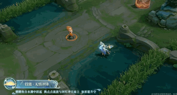 特效设计以寄托着重逢祈愿的“河灯”、灵鱼“鳛鳛鱼”为核心视觉元素,寓意离别之人终得团圆。配色上,主要运用了象征河灯的暖金色与代表水体的蓝色,随着技能的释放,将伴随丰富的光斑效应与闪烁的水色光晕,增强整体的流动感与光影层次。