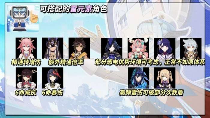 雷元素角色:北斗/赛诺/赛索斯/八重神子/菲谢尔/九条裟罗/欧洛伦/克洛琳德/瓦雷莎/雷泽。其中,北斗6命提供15%雷减抗,赛诺、八重神子、赛索斯可堆精通转增幅,6命九条裟罗可提升伊涅芙攻击力与暴击伤害。