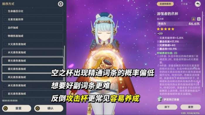 个人建议,空之杯的主词条种类太多,精通杯获取概率偏低,同时还想要好词条那就更难了!因此冻梨自身是选择精通沙+攻击杯,更容易配出好的副词条来。