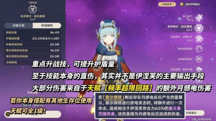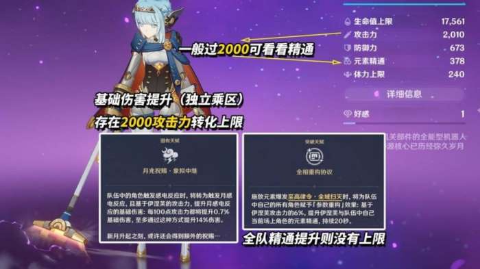 【全队增幅】触发感电反应时生成雷暴云,每2秒对水雷共存敌人造成月感电伤害(可暴击);施放终结技时全队提升伊涅芙攻击力*6%的元素精通;基于伊涅芙每100攻击力提升0.7%月感电基础伤害,至多提升14%(需2000攻击力)。