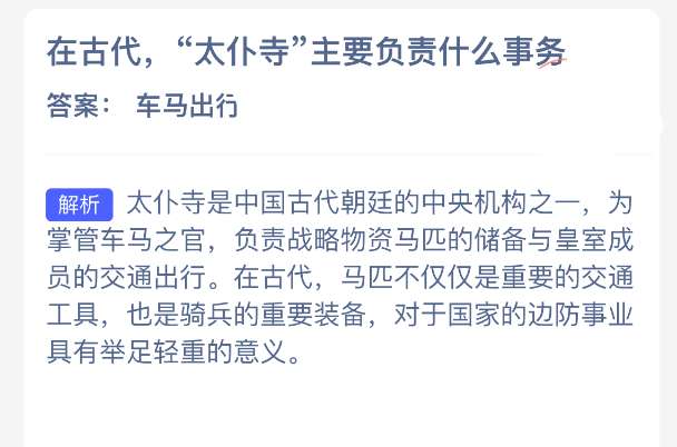 以上就是在古代,“太仆寺”主要负责什么事务?支付宝蚂蚁新村最新答案2026年2月3日,更多精彩内容,请点击关注pk游戏网更新!