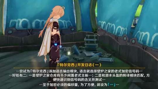 【偏移量‘一’】应该有不少玩家纳闷,这个加密文字的内容是何意?在营地帐篷可以得知,特尔克西装配的语言模块选择的是愚人众壁炉之家的老式加密信号码。菲米尼为了图方便,将其偏移量设置为‘一’。