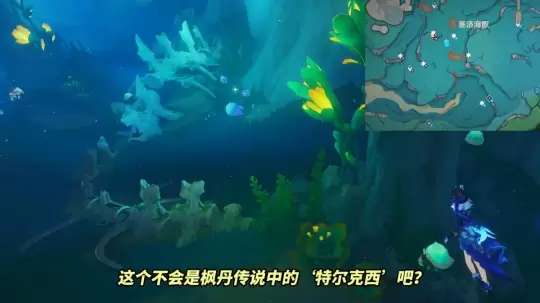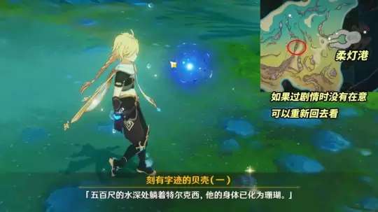 【刻字贝壳】首日剧情随着菲米尼下水采集材料时,会遇到一个发光点,与其交互‘刻有字迹的贝壳(一)’。五百尺的水深处躺着特尔克西,他的身体已化作珊瑚。五百尺,约为167米,似乎还挺深。