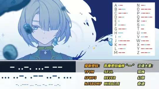 所以活动中这个加密方式是,摩斯密码+凯撒密码?活动界面3段加密文字解答后结果是“seul rever miracle”,经过翻译在法语中的意思大概可以理解为“孤独、幻想、奇迹”。