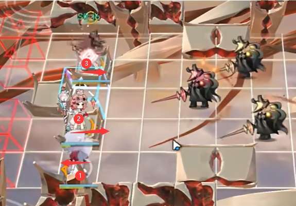 如图所示开局部署【①能天使】产费,随后部署【②澄闪】【③艾雅法拉】向右。