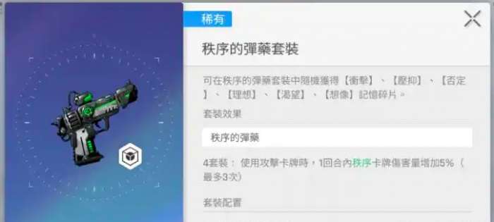 第三种搭配思路是攻击强化流,选择制取的弹药四件套和黑翼两件套,这一套装与雨果的适配度很高,也可以尝试在一些高频攻击的基础卡牌角色身上使用,其中秩序的弹药可对基础卡还进行专门强化,而黑翼则可对攻击力进行提升,每一次的普攻也能够达到非常不错的效果,对于早期将获得雨果的卡牌的玩家来说,可尝试。