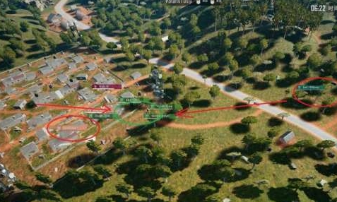 集中跳点并不是一成不变的战术,而是要根据跳点的实际情况分析,红区域为三人队伍一起落在房区,虽然集中在一起反而是个活靶子。褐队伍分布就比较均匀,一个人拉到野外搜完装备后去山上架枪,负责视野。剩余的三个人则慢慢包围绿队伍的房区,等待队友集合后直接灭掉他们。