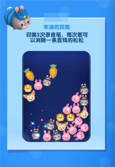 除了消除的模式不同,《松松总动员》的消除玩法还有一个特别大的亮点,那就是松松队长的技能!当抽到SR或者SSR后,我们就可以把这些松松任命为松松队长,在消除的过程中,这些松松队长就会释放出技能来消除更多的松松。不同的松松队长的技能也完全不同,不过都能找到原作的影子,比如朱迪警官就可以召唤录音笔
