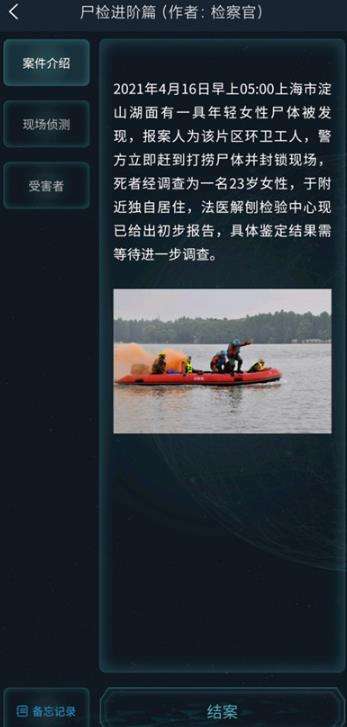 2021年4月16日早上05:00上海市淀山湖面有一具年轻女性尸体被发现,报案人为该片区环卫工人,警方立即赶到打捞尸体并封锁现场,死者经调查为一名23岁女性,于附近独自居住,法医解刨检验中心现已给出初步报告,具体鉴定结果需等待进一步调查。