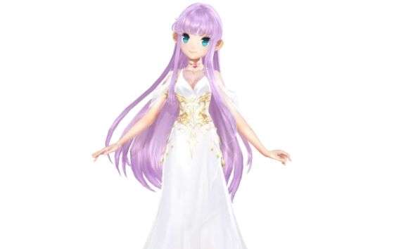 银紫色及腰长发,白色连衣纱裙神金雕饰在密细白纱裙性感迷人,腰间的金色纹饰象征着雅典娜女神至高无上的地位。