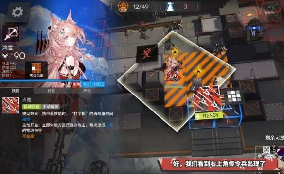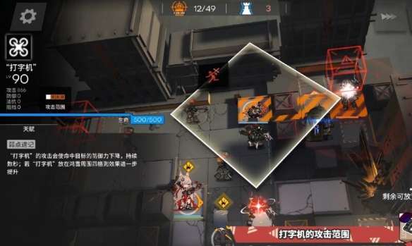 下图中可以确定的是打字机只能部署在高台位,且攻击距离是黑战术终结7级时的距离(即身前三格),同时,满配打字机的攻击白值是866,从官方演示中逐帧看,打字机对传令兵先平a了2次,后放二技能有3根带特效的箭飞出,最后平a一次传令兵倒下,粗略的计算了一下,二技能的倍率在215%和240%之间,而未放置在鸿雪身边的打字机,减防的效果大概在10%-20%,一次二技能的释放,对0防的目标可以打出5400-6000的伤害,如果演示的不是专三,那预测专三再加攻击倍率或技能储存量或单次技能攻击次数,专三收益有没有质变不知道,高攻的面板,专三收益肯定大