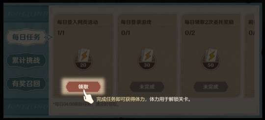 1、解锁关卡需要体力,获得体力需要完成每日任务和累计挑战任务,建议将原神每日完成之后再来游玩该H5。每天至少能解锁两个关卡。