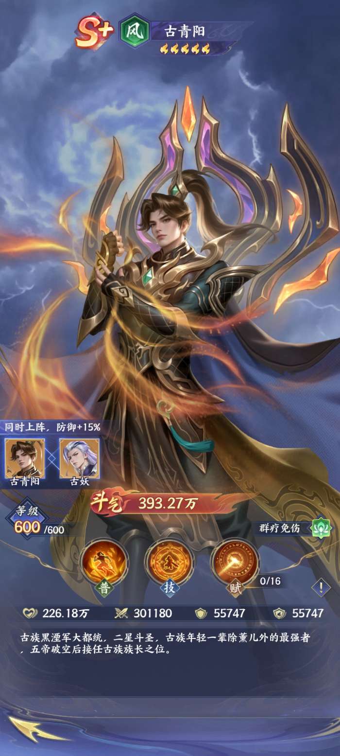古青阳的阵容搭配,其实对于玩家来说,他其实能够跟古妖形成不错的羁绊效果,这样能够进一步的提升自己的生存能力,也能够让他在战斗的过程当中更好的去承受伤害。另外,玩家可以尝试利用它跟萧炎、美杜莎等等角色进行搭配。
