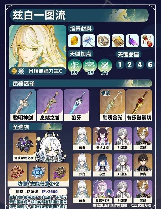 配队:绑定岩水体系,天赋需求满辉效果,队友可以是叶洛亚(2命)或者是爱诺来触发满辉