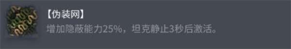 提供高达25%的隐蔽加成,在坦克静止3秒后生效,适合蹲草观察或防止被点亮。