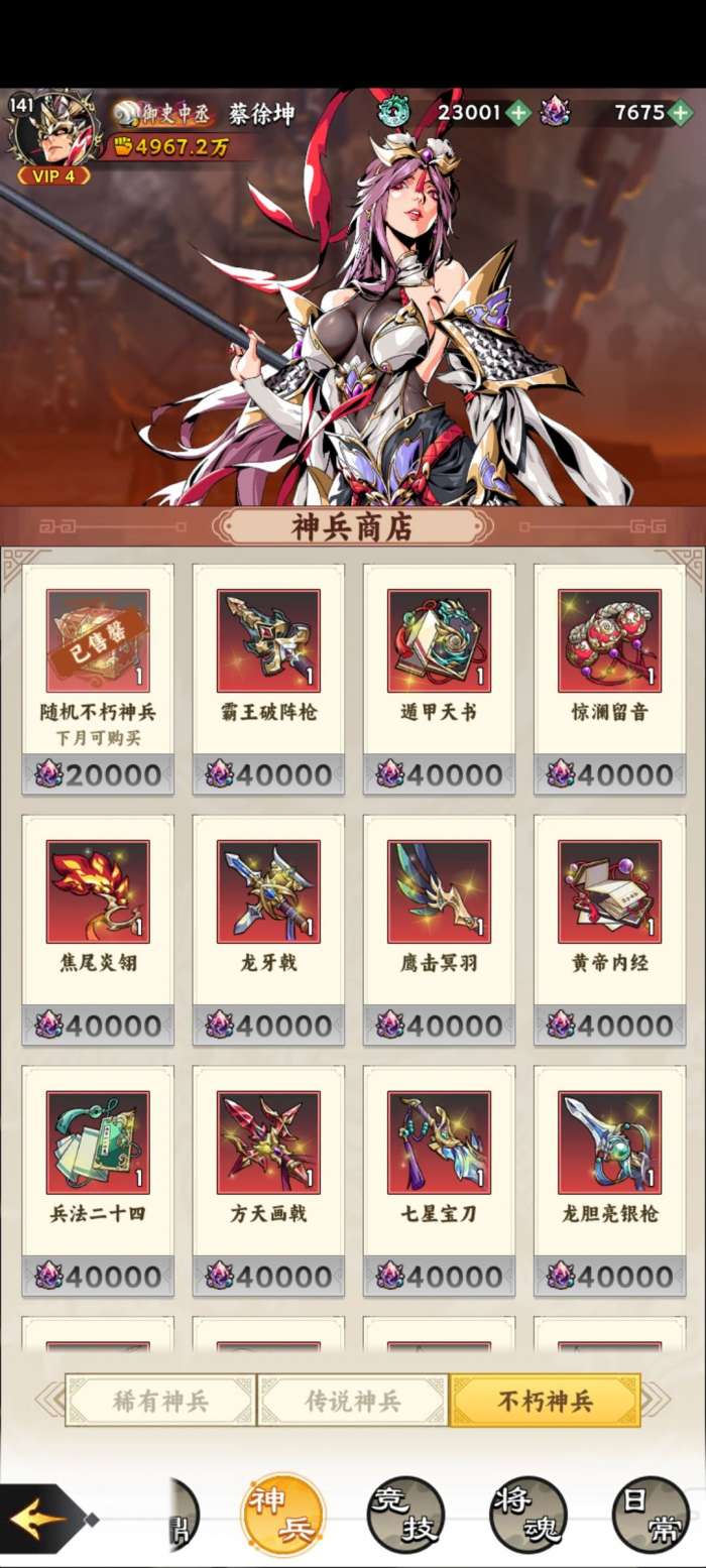 神兵商店主要买自己阵营主力专武,其次买阵营坦克的专武(魏阵营买董卓的),再买曹操专武给主力带,让主力有伤害吸血。后续正常开神兵全部图鉴。优先做主C能带的神兵。