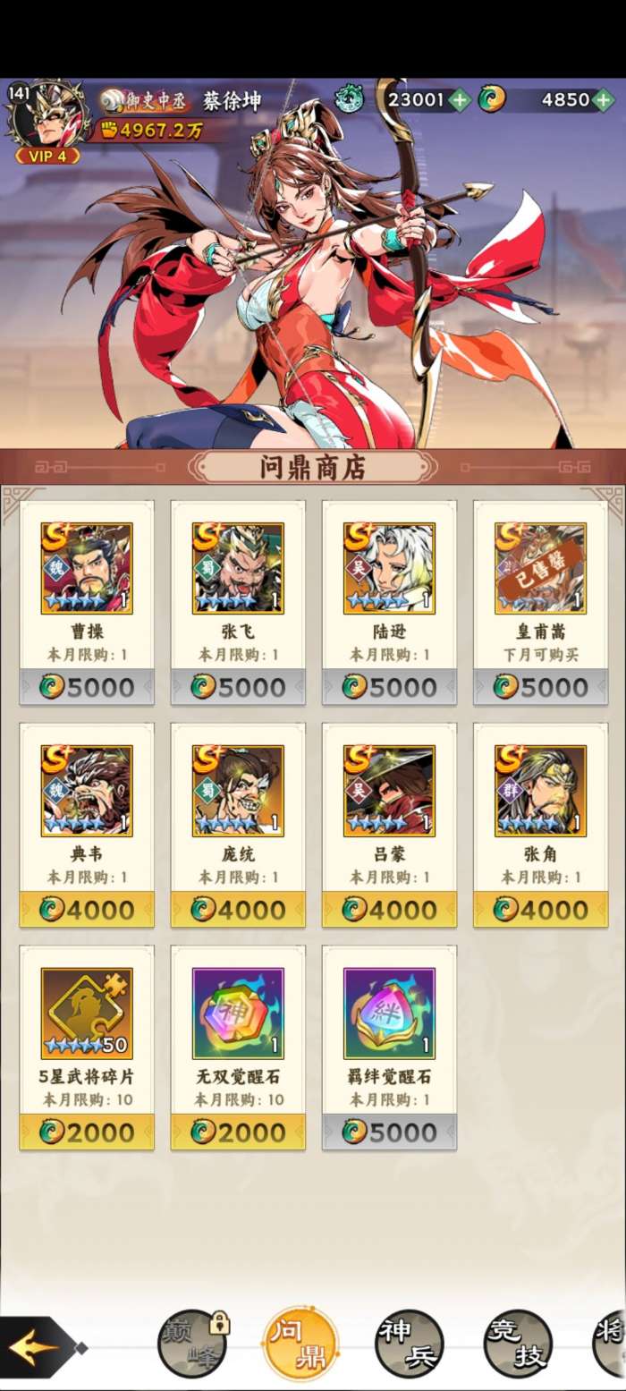 问鼎商店主要买无双觉醒石和羁绊觉醒石,角色17星升18星时要1个无双觉醒石,后面的我星级没到还不清楚。