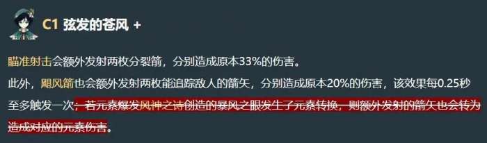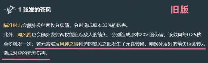 删除效果:删除“若元素爆发风神之诗创造的暴风之眼发生了元素转换,(飓风箭)额外发射的箭矢也会转为造成对应的元素伤害”。