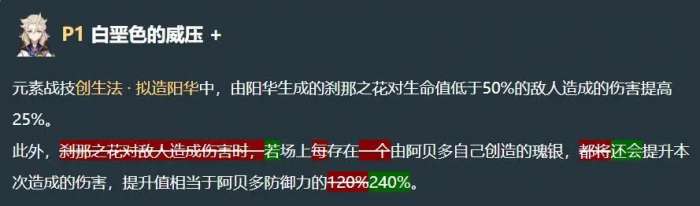 旧版效果:刹那之花对敌人造成伤害时,场上每存在一个由阿贝多自己创造的瑰银,都将提升本次造成的伤害,提升值相当于阿贝多防御力的120%。