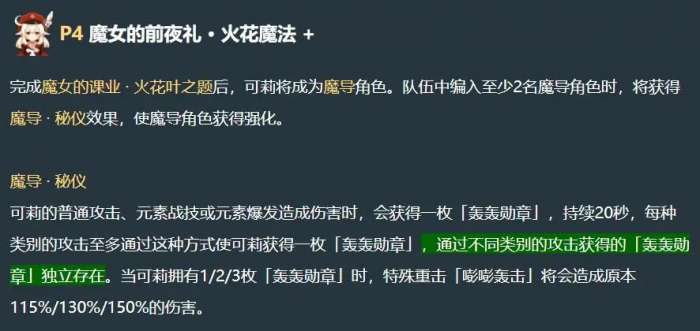 简单来说:可莉的普攻、战技和大招造成伤害时可以获得1枚轰轰勋章,最多获得3枚,最多使特殊重击造成原本150%的伤害。