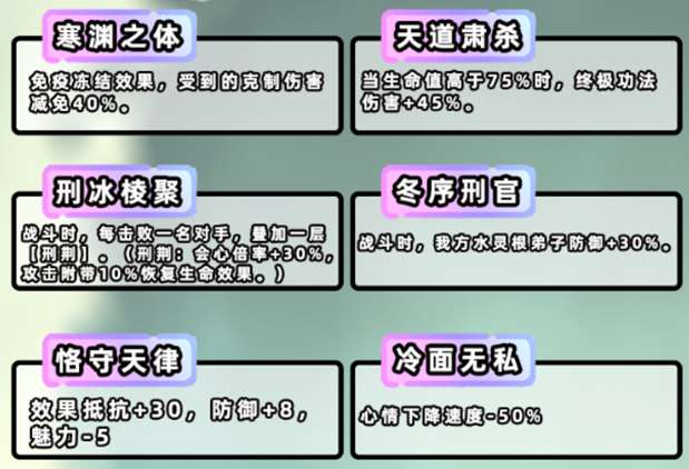 防御端:玄冥受到克制伤害减免40%,且全队水灵根弟子防御+30%。但目前土灵根输出较少,且防御的减伤效果一直为人诟病,整体效果一般(天道水坦敖丙面板防御较低,加成效果不明显)。