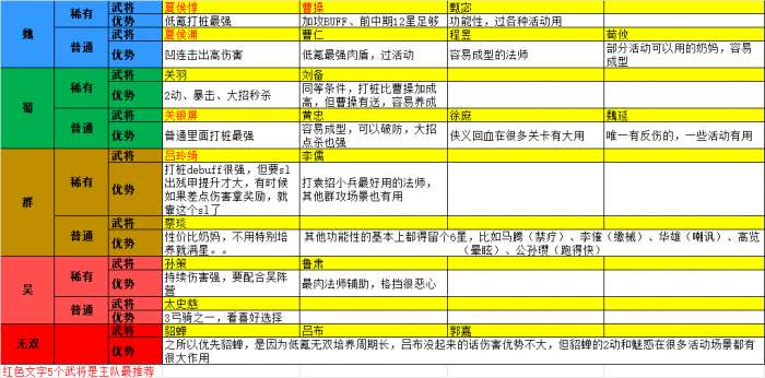 稀有:关羽(2动、暴击、大招秒杀,在很多场景都很有用)、刘备(同等条件,打桩比曹操加成高,但曹操有送,容易养成)、张飞和赵云PVP的功能大点